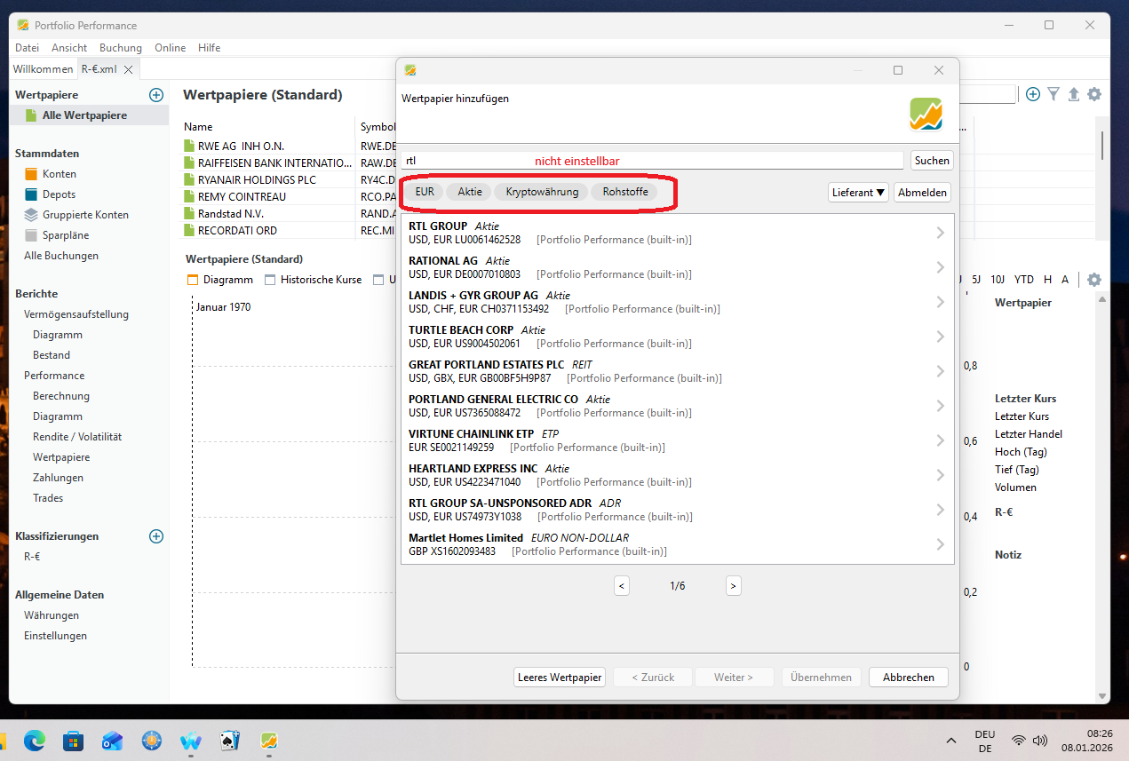 Bei der Aktiensuche kann ich nicht einstellen, ob ich ein Wertpapier nur als Aktie suche, also nicht als Kryptowährung z. B., oder noch den Papierwert entweder USD oder Euro suche.