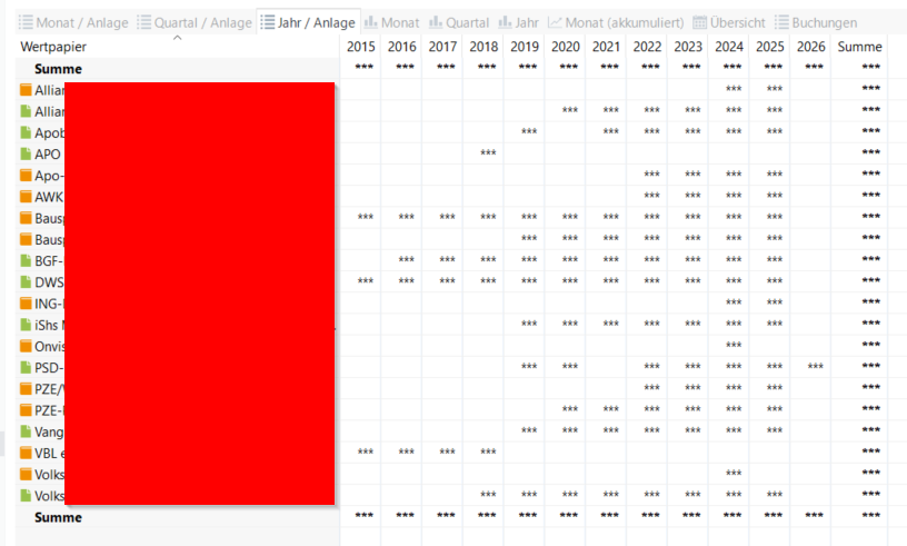 Wenn ich mir unter Berichte –> Zahlungen die Zahlungen der einzelnen Positionen anzeigen lasse, verliere ich in der Quartals-Ansicht mittlerweile schnell die Übersicht. Nach 10 Jahren passt das alles nicht mehr in eine Bildschirmansicht. Hier die Jahresansicht:
