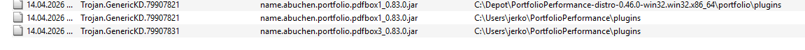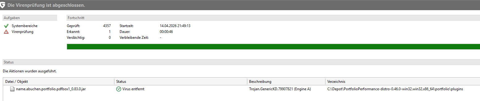 “Die Datei \Programme\portfolio\plugins\name.abuchen.portfolio.pdfbox3_0.74.0.jar ist mit Trojan.GenericKD.75596630 infiziert und wurde in die Quarantäne verschoben.”