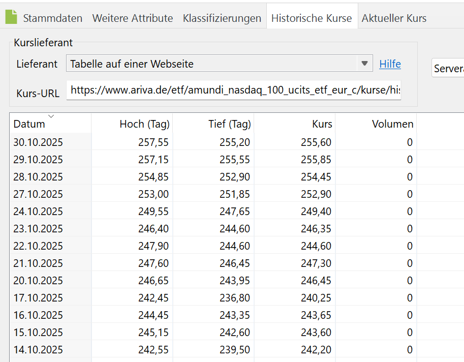 Anhand der historischen Kurse kann man sehen, dass PP die Kurse das letzte Mal 27.10.2025 aktualisiert hat. Die aktuellen Kurse sind wie die historischen Kurse konfiguriert.
