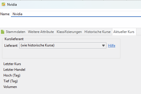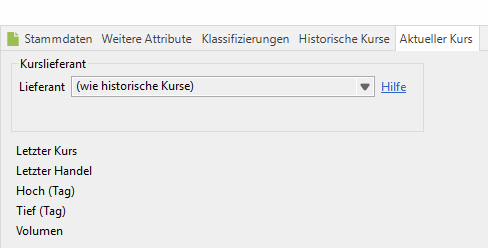 Die Anzeige dient zur Ansicht der Daten aus den aktuellen Kursen. Du hast keine aktuelle Kursquelle definiert (also nur PP aber der liefert ja “nur” EOD Daten). In den Tabellen (z.B. bei Wertpapier, wird bei den Kursen beim letzten Kurs dann der letzte vorliegende genommen. Das passiert in der Pane dort unten nicht, dort wird nur das vom aktuellen Kurs angezeigt. Kann man nachstellen, wenn man mal die Quelle für aktuelle Kurse auf Yahoo umstellt.