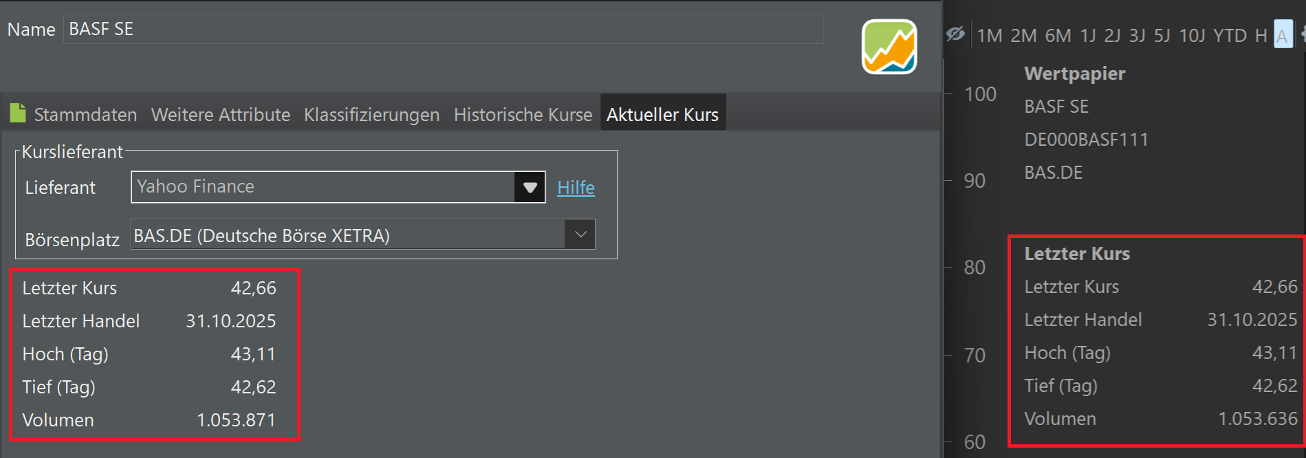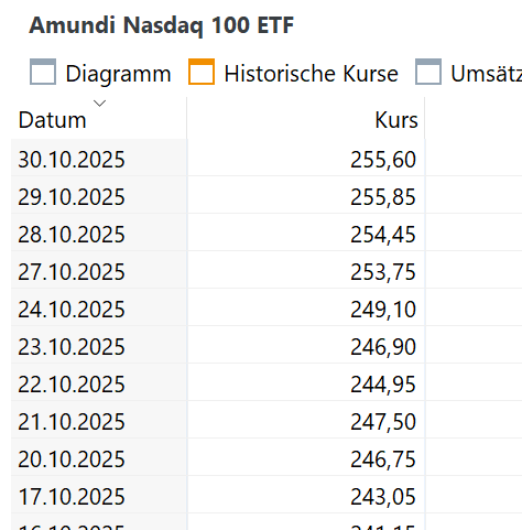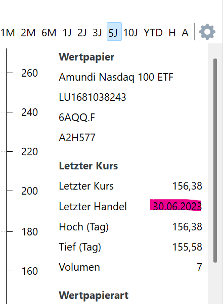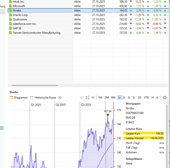 Wenn bei Dir letzter Handel 19.09.2025 steht hast Du wahrscheinlich eine fehlerhafte Konfig der aktuellen Kurse.