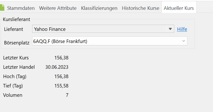 Dann habe ich in dem Wertpapier bei “Aktueller Kurs” den Kurslieferant von “(wie historische Kurse)” auf “Yahoo Finance” geändert, gespeichert und eine Kursaktualisierung angestoßen. Anschließend wurden die Felder bei “Letzter Kurs” auch ausgefüllt:
