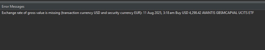 “Imported transaction currency does not match instrument currency and no exchange rate is provided in the import file. Actual exchange rate from EZB was used. You can change the exchange rate in the transaction dialog later ….”