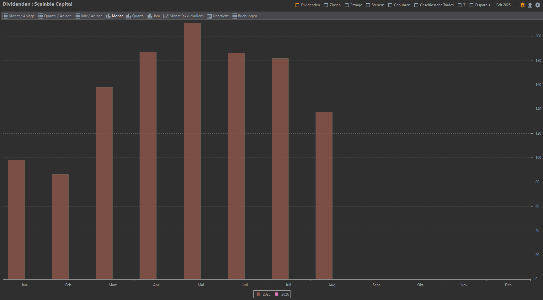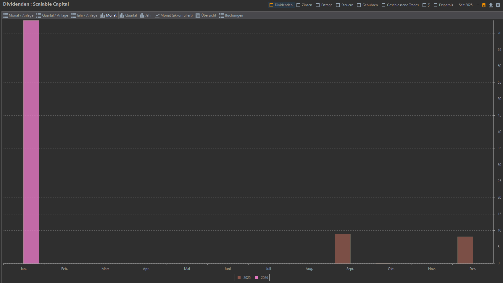 Dargestellt sind hier nur die Dividendenzahlungen vom Scalable-Depot, normalerweise stelle ich die Dividenden mit gruppierten Konten dar, um es einfach zu halten hier nur Scalable.