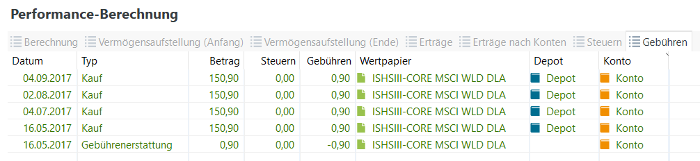 bzw. die Ansicht “Performance Berechnung” mit dem Reiter “Gebühren”
