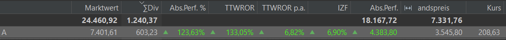Ich verstehe: die “Abs.Pef.” berücksichtig nur die tatsächlichen Auszahlung, d.h. Dividende excl. Steuern. Dazu passt entsprechend die “Abs.Perf.%” von 123,63%.