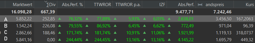 Aktie B und Fonds C zeigen interessanterweise weiterhin deutliche Abweichungen zwischen Abs.Perf.% und TTWROR - beide weisen Ausschüttungen auf: 80 vs 87% bzw. 172 vs. 182%