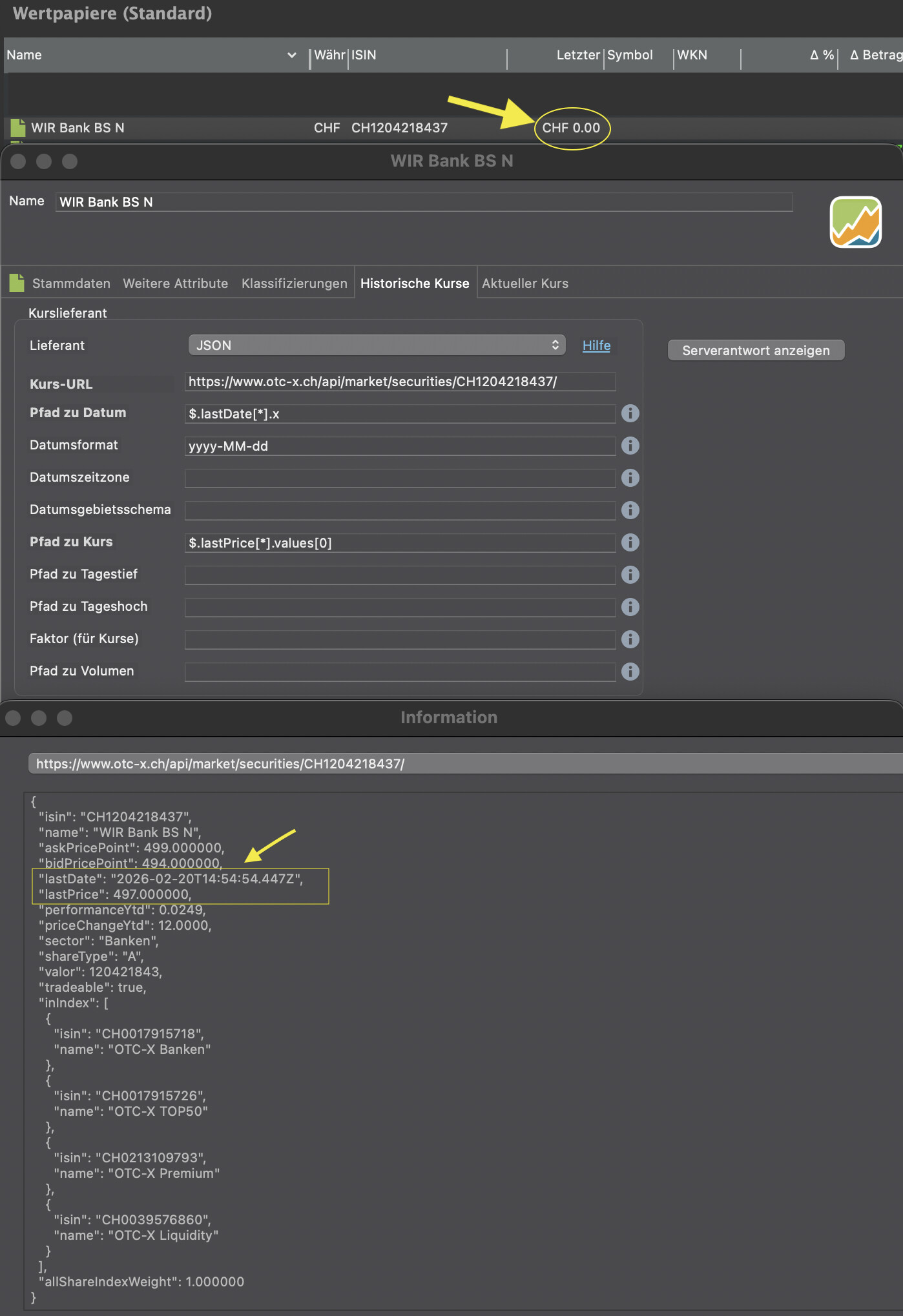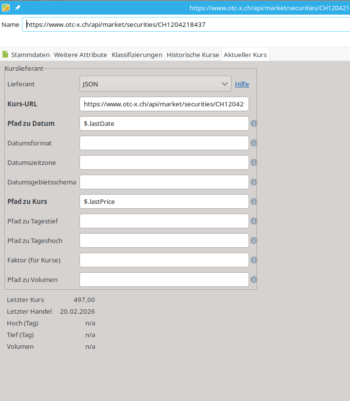 … leider wird der aktuelle bzw. letzte Kurs in Höhe von 495,- CHF in PP (nach Aktualisierung) mit “0.00” angezeigt. Irgendwie scheint auf meiner Seite der Wurm drin zu sein.