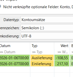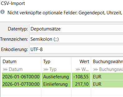 Leider kann Portfolio Performance seine eigenen csv-Dateien nicht richtig interpretieren. Dies betrifft Einlieferung und Auslieferung, das Exportieren der Depotumsätze funktioniert, aber beim Einlesen scheint PP diese Kategorien nicht zu kennen!