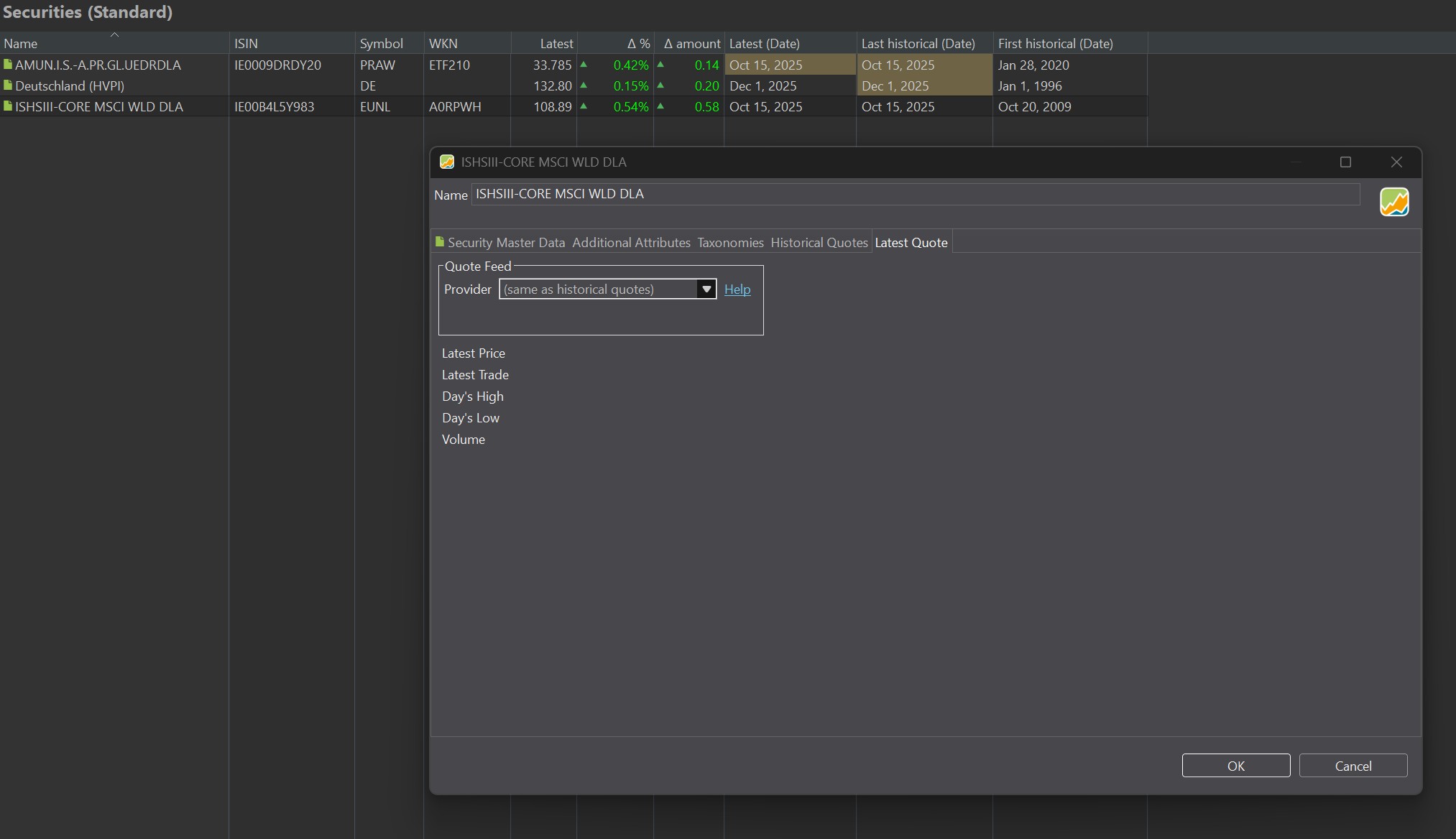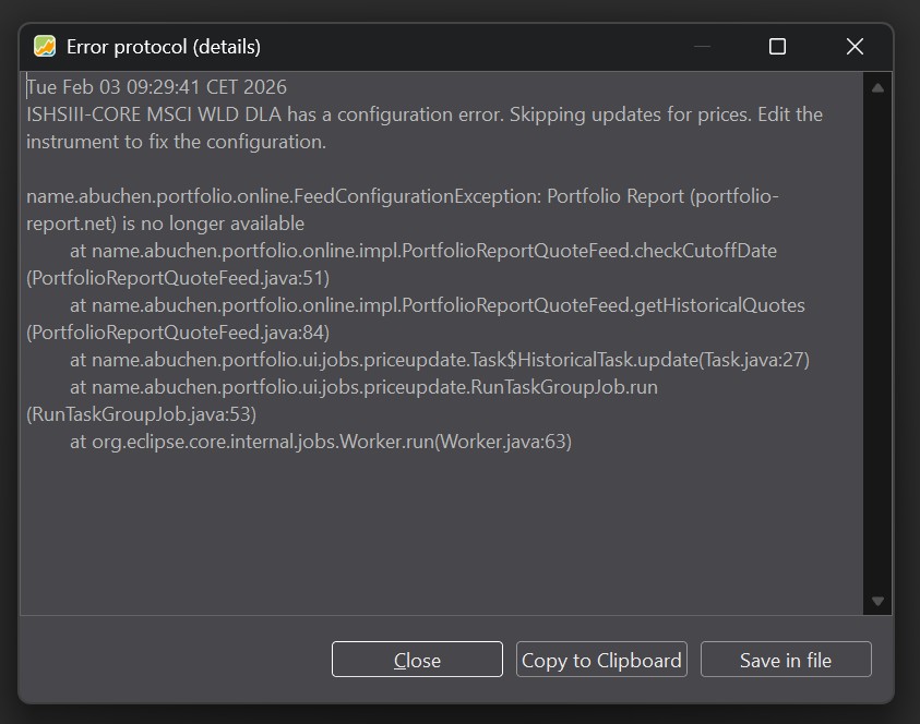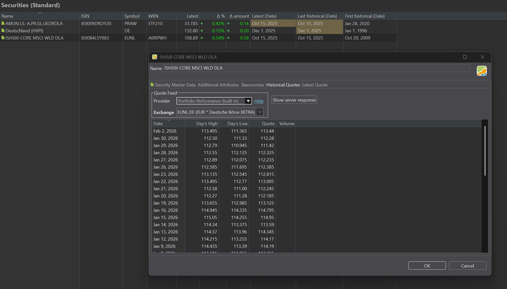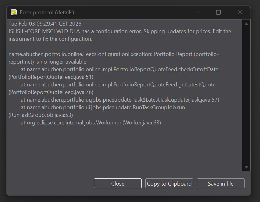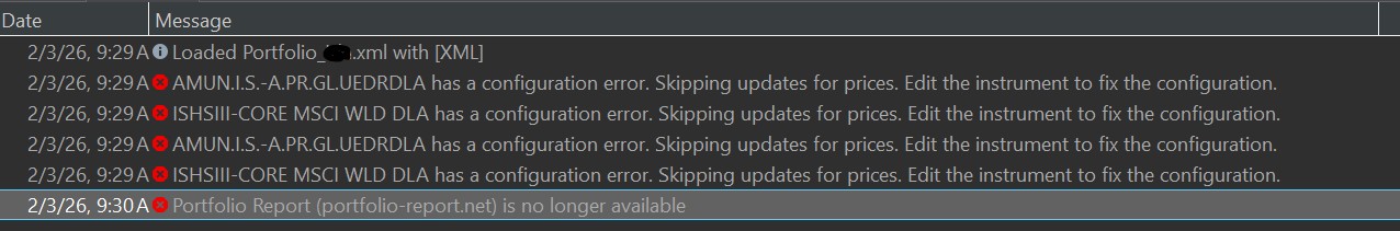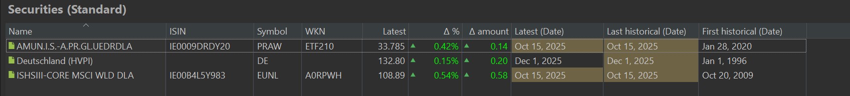 I am using Portfolio Performance for years now, but only on a surface level. Until 10/2025 it worked really nicely, but now I have some issues with my ETF quotes. For example I have this overview: