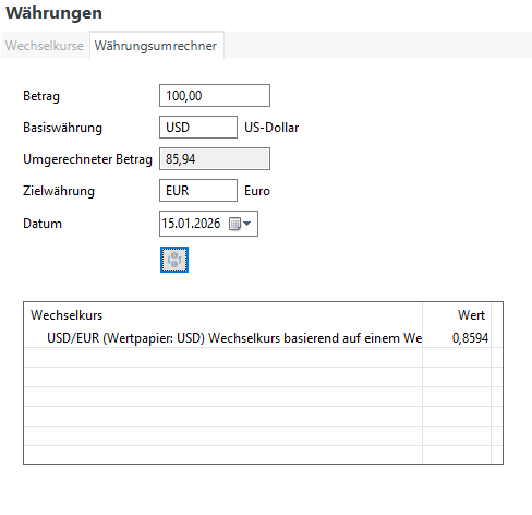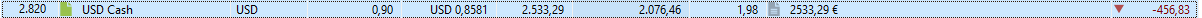 Ich habe in meinem Bestand 2.820 USD eingetragen. Beim aktuellen Wechselkurs von 0,8581 sollte der Marktwert korrekt mit 2.419,84 € berechnet werden. Stattdessen zeigt das System jedoch einen Wert von 2.076,46 € an.
