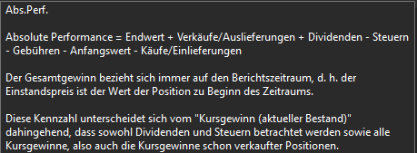 Damit kannst du sowohl für komplett verkaufte (Bestand = 0) als auch teilverkaufte die Performance im Überblick anzeigen lassen.