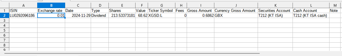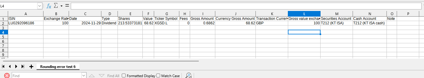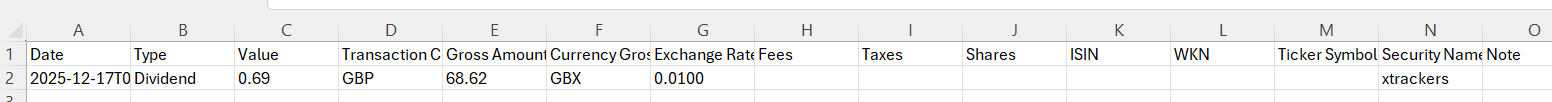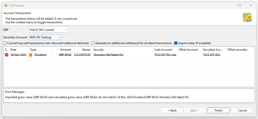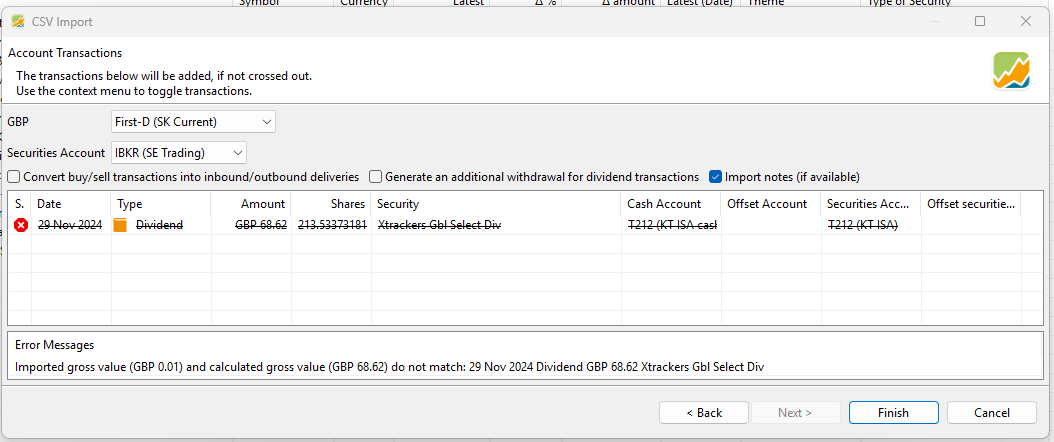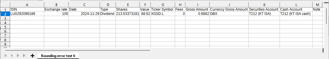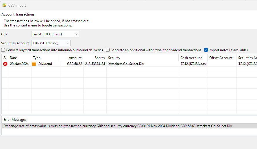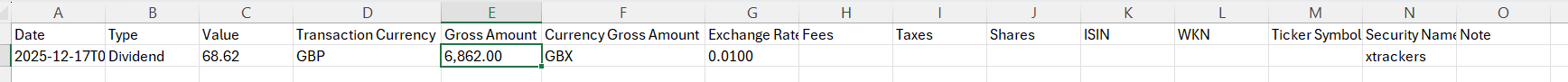 Second, where does the value GBP 69.00 come from? Is PP rounding down the Imported value and then finding an error? Maybe the issue lies in the conversion from GBX to GBP. I do not get this error when importing dividends where the security currency and the transaction currency are both GBP.