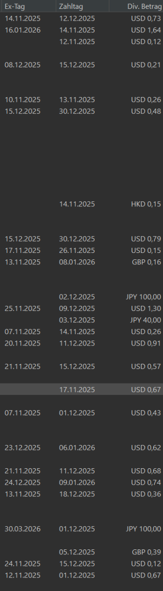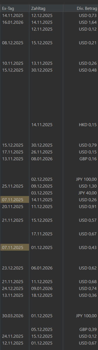 Seit einigen Updaten können Ex-Tage, Zahltage und Dividendenbeträge angezeigt werden. Dieses Feature find ich Spitze.
