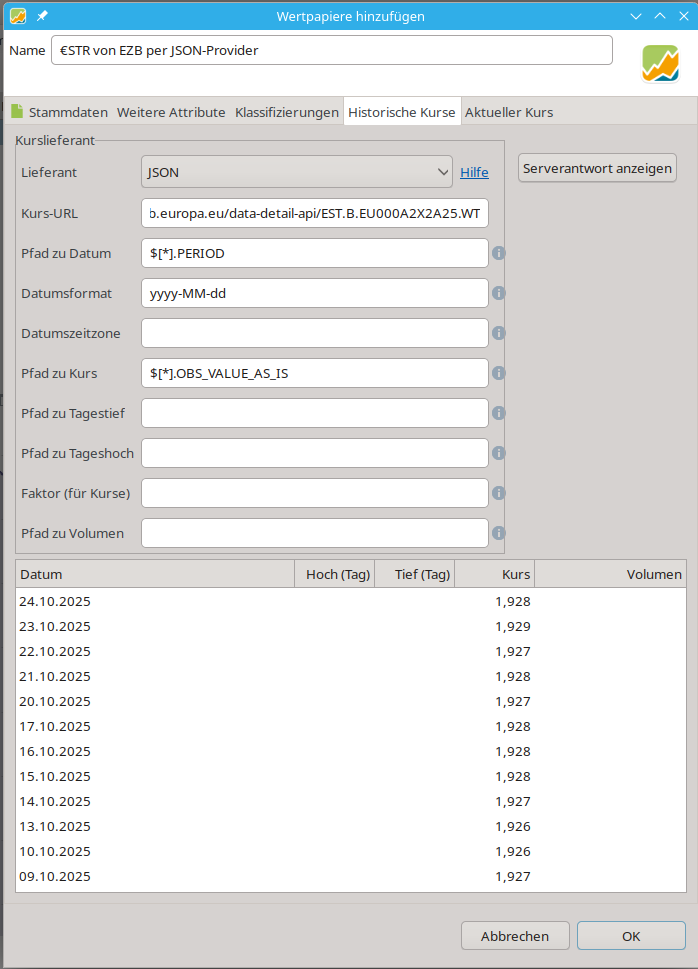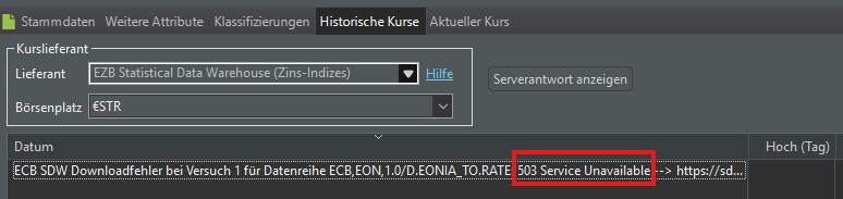 der im Programm hinterlegte Kurslieferant “EZB Statistical Data Warehouse (Zins-Indices)“ liefert bei mir seit einigen Wochen keine Daten mehr. Ich habe beispielsweise ein Wertpapier für €STR angelegt und dort sind die letzten Daten vom 22.09.2025. Betroffen scheinen aber alle Datenreihen zu sein.