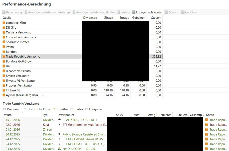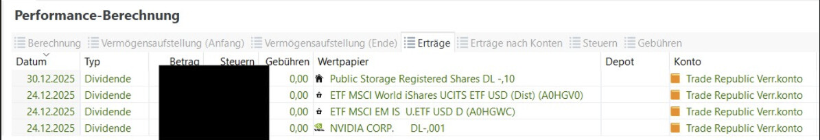 zum ersten Mal scheinen Erträge in der Performance-Berechnung → Reiter Erträge (!) nicht korrekt angezeigt zu werden. Ab 01.01.2026 fehlen sie.