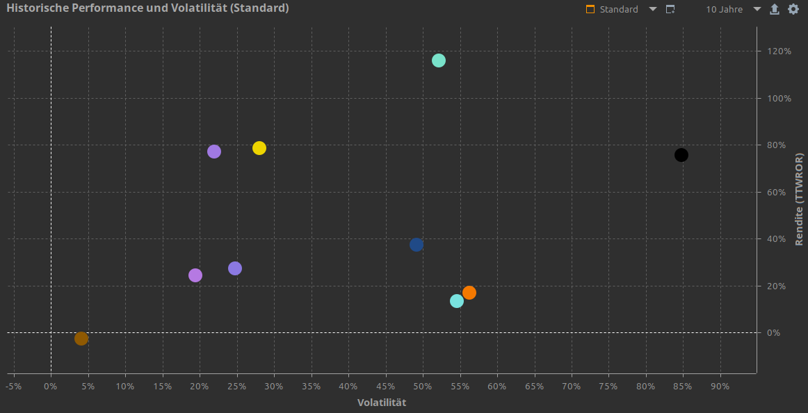 Ja, jeweils 10 Jahre. Hier ein Screenshot, der das Problem verdeutlicht. Der schwarze Punkt ganz rechts ist das Gesamtportfolio, die Vola ist aber viel höher als bei allen Einzelwerten, was zumindest für mein Verständnis keinen Sinn macht, das gesamte Portfolio kann ja nicht stärker schwanken als der volatilste Einzelwert.