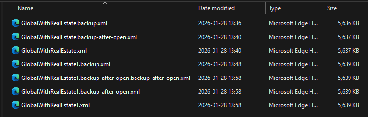 I changed it to “GlobalWithRealEstate” and then, out of real scare of not saving all the work, I saved as “GlobalWithRealEstate1”. You can see both of them in the screenshot