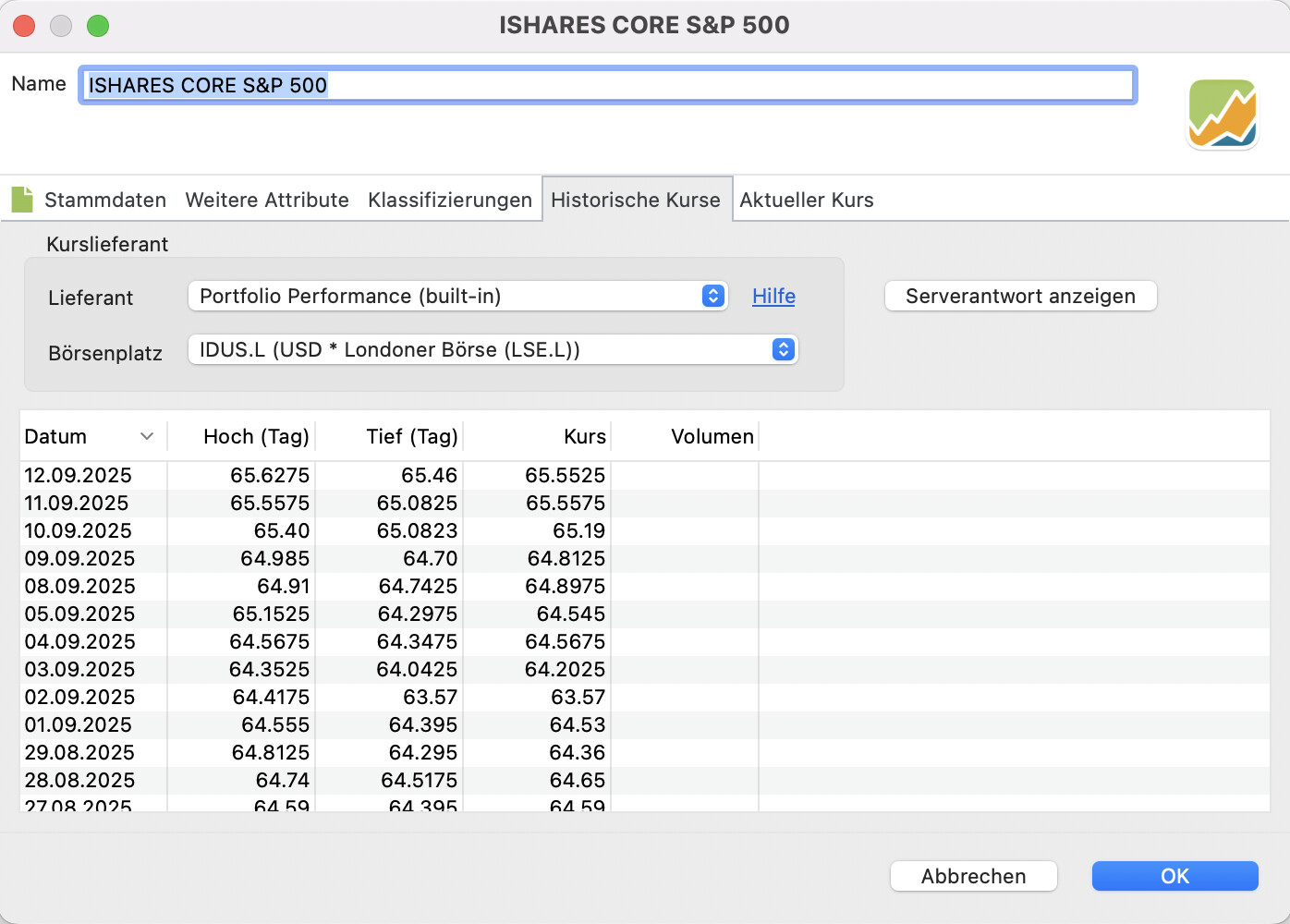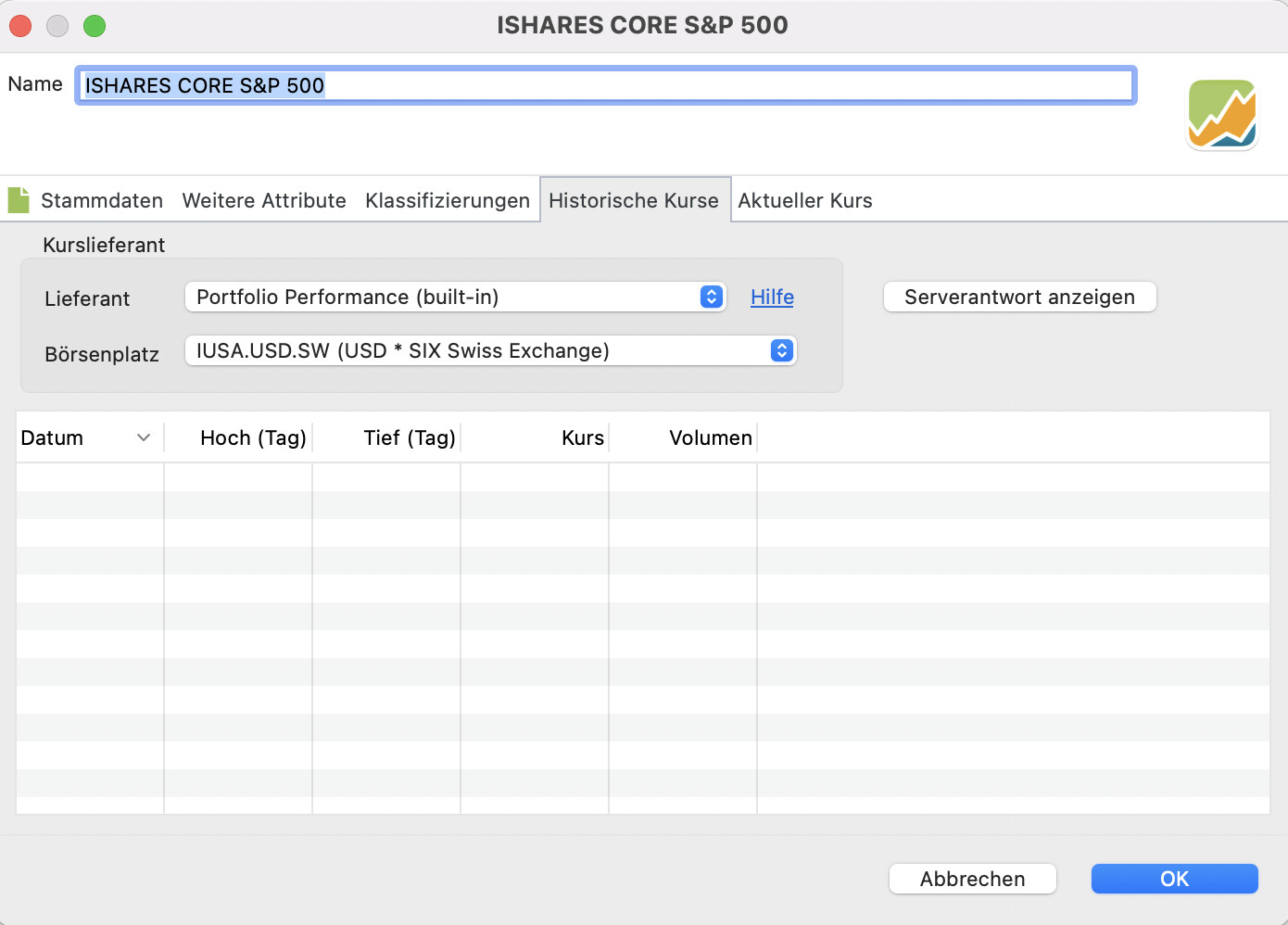 Beim ETF “IUSA.USD.SW” werden die historischen Kurse aus irgend einem Grund nicht geladen. Die Kurse vom selben ETF an anderen Börsenplätzen (z.B. IUSA.DE) werden jedoch korrekt geladen.