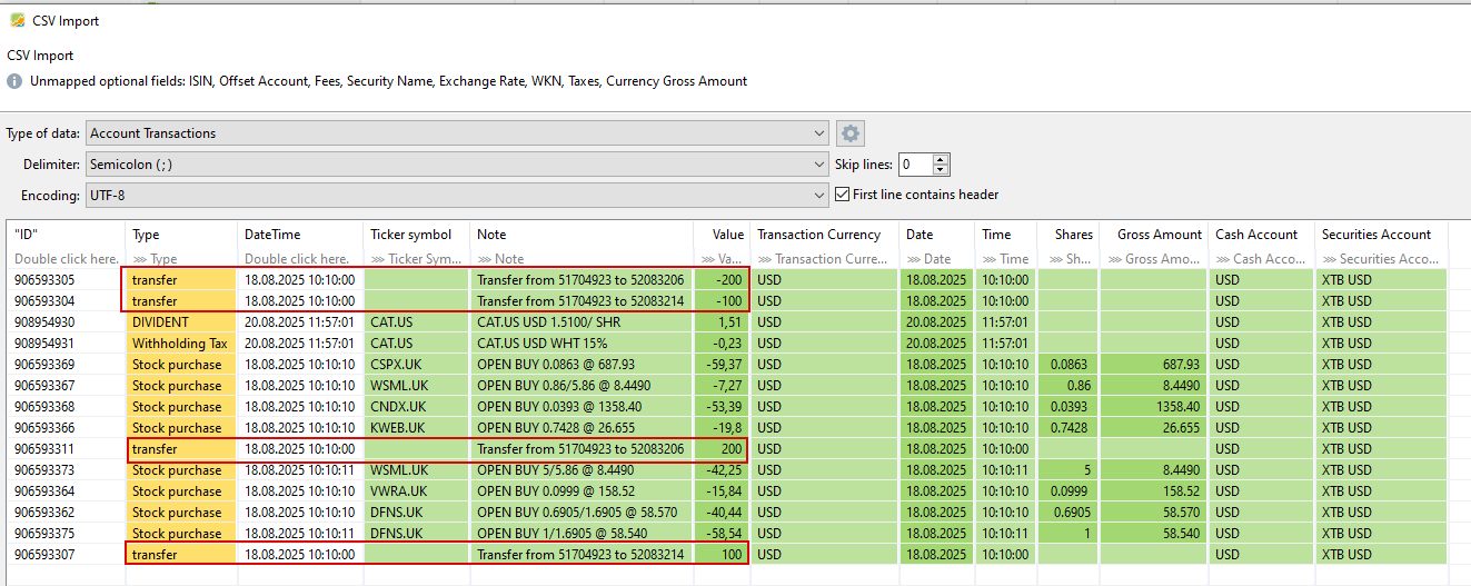 the transaction look like this:“906593305”;“transfer”;“18.08.2025 10:10:00”;“”;“Transfer from 51704923 to 52083206”;“-200”;“USD”;“18.08.2025”;“10:10:00”;“”;“”;“USD”;“XTB USD”