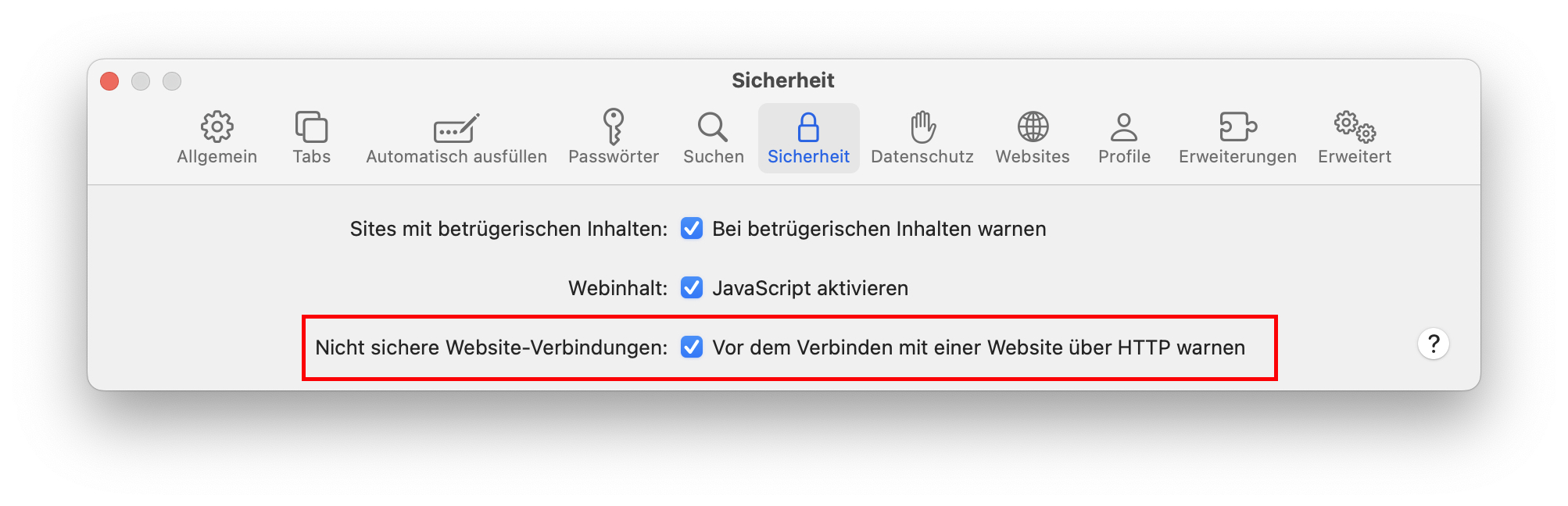 Zu Safari konnte ich nur den Hinweis finden, die Option “Vor dem Verbinden mit einer Website über HTTP warnen ” zu deaktivieren, sowie den Tipp , das Tab zu schließen und mit Cmd+Z erneut zu öffnen.