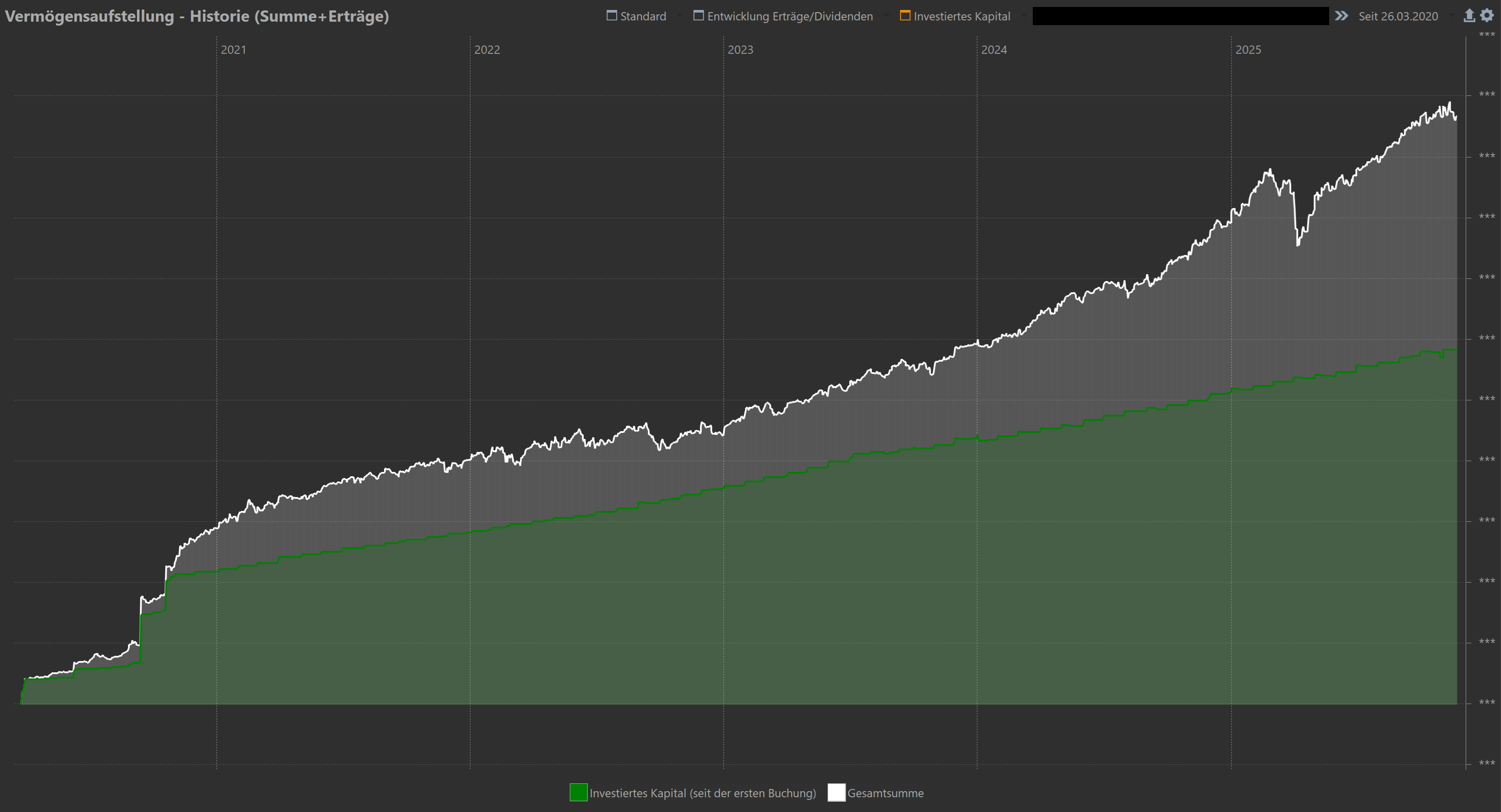 Die Ansicht aus meinem Screenshot besteht aus der Datenreihe “investiertes Kapital (seit der ersten Buchung” und “Gesamtsumme”. Die Farben kann man auch frei konfigurieren und auswählen ob die Flächen gefüllt oder nur die Linien dargestellt werden sollen.