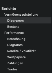Unter Berichte → Vermögensaufstellung → Diagramm und Berichte → Performance → Diagramm kann man sich die Entwicklung der Marktwerte der Wertpapiere und Assetklassen sowohl in € als auch % als Liniendiagramm anzeigen lassen.