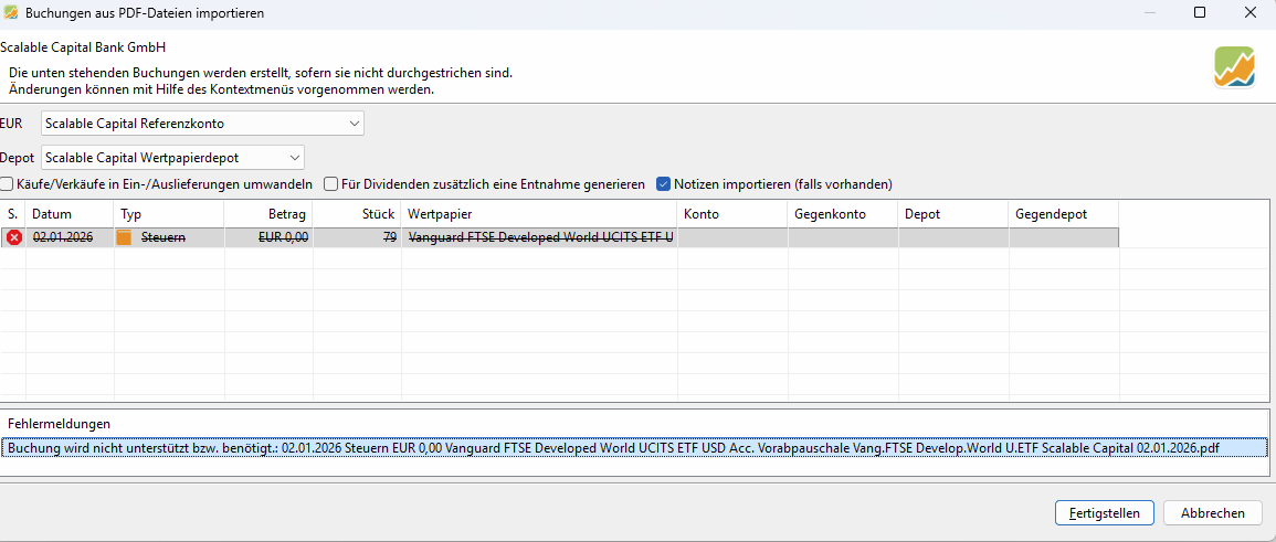 ich nutze Portfolio Performance 0.81.5. Beim Import meiner Bescheinigung der Vorabpauschale von Scalable Capital kommt es zu folgender Fehlermeldung.