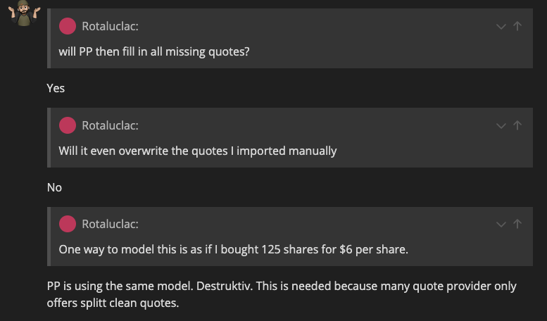 t2: The share now has a (historically correct) value of $40 per share. There’s a 1:5 stock split. I model this as a buy og 100 shares for $0, followed by an immediate change of the share price to the (historically correct) value of $8.