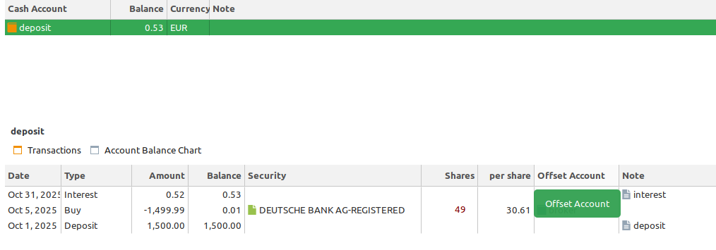 OK, thanks for the thorough answer. Itâs a bit of a cumbersome solution, but Iâll give it a try. Or maybe Iâll simply change the interest entries to deposits.