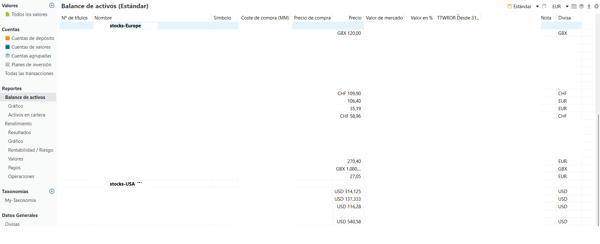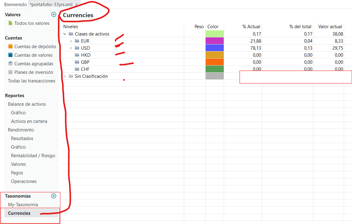After your assignment, you can double check via statements of assets, just use your newly created taxonomy. (Top right corner) This view will group each currency. This way you’ll easily see if you assigned everything right.