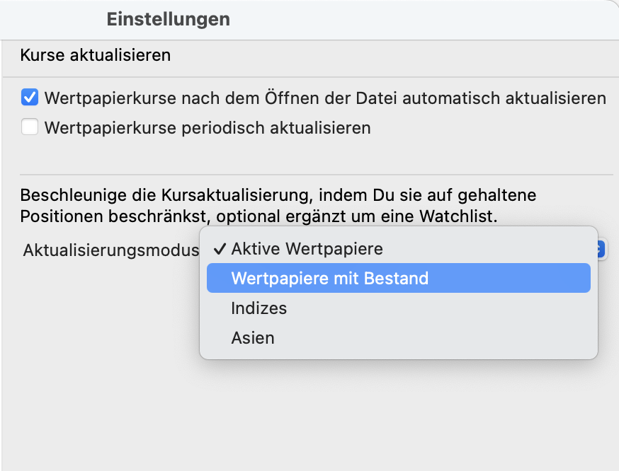 Mit der nächsten - noch nicht veröffentlichten September (?) Version - kannst Du sowohl kontrollieren ob periodisch Kurse aktualisiert werden sollen als auch welche Wertpapiere standardmässig aktualisiert werden - alle aktiven, nur Wertpapiere mit Bestand oder Wertpapiere mit Bestand ergänzt um eine Watchlist. (Meine Annahme ist, dass man Wertpapiere mit aktuellen Bestand immer aktualisieren will). Damit kannst Du dann besser steuern.