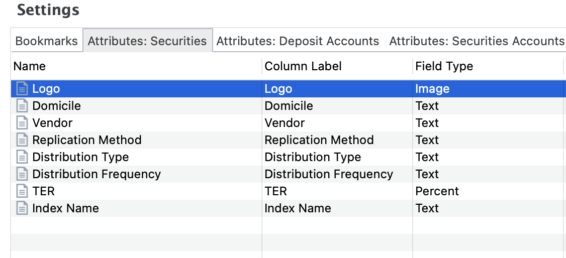 Can you share the screenshot of your “settings” sections for “Attributes: Securities”.