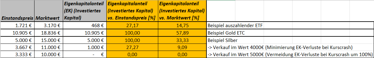 In den Wertezeilen 3 bis 5 ist ein theoretisches Szenario mit Silber aufgezeigt, bei dem man auf Basis von EvE und EvM seine Risiken anpassen kann, je nachdem was für ein Risikotyp man ist.