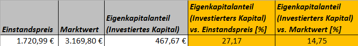 Ah, Danke für den Hinweis. Die Dividendenrendite-Anzeige von PP (Dividend-Yield On Cost (YOC)) hatte ich noch gar nicht gesehen. Vorsicht aber bei der Gleichsetzung von Einstandspreis und Eigenkapital. Das ist in PP, so wie ich es verstanden habe, nur gleich beim gesamten Betrachtungszeitraum und wenn es keine Kapitalabflüsse gibt. Kapitalabflüsse wie Dividenden oder auch Teilverkäufe werden vom Eigenkapital(-anteil) abgezogen.