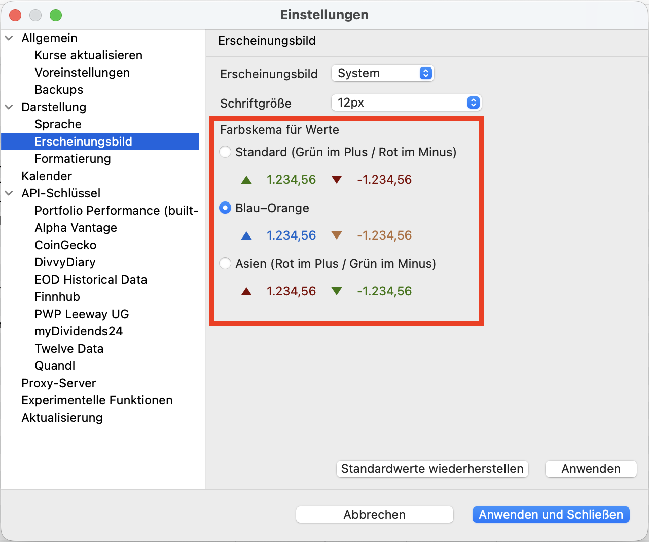Bisher sind positive Werte grün und negative Werte rot angezeigt worden. Das funktioniert jedoch für Farbenblinde nicht so gut. Außerdem steht in Asien steht rot für positive Werte. In den Einstellungen kannst Du jetzt zwei weitere Farbschemata auswählen: Blau/Orange und Asien (Rot im Plus / Grün im Minus).
