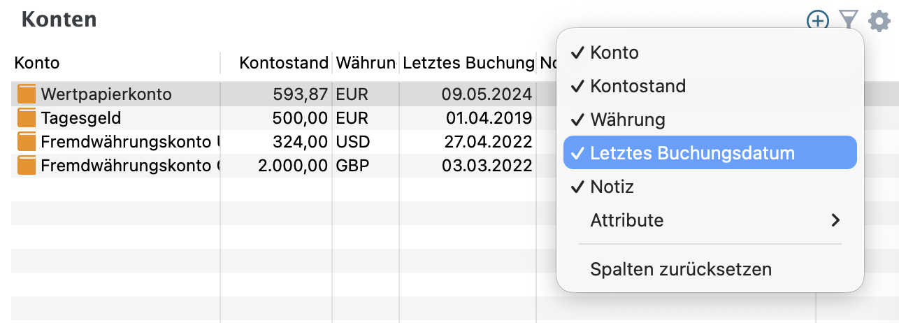 Neu: Optionale Anzeige des Datums der letzten Transaktion in Konten und Portfolios.
