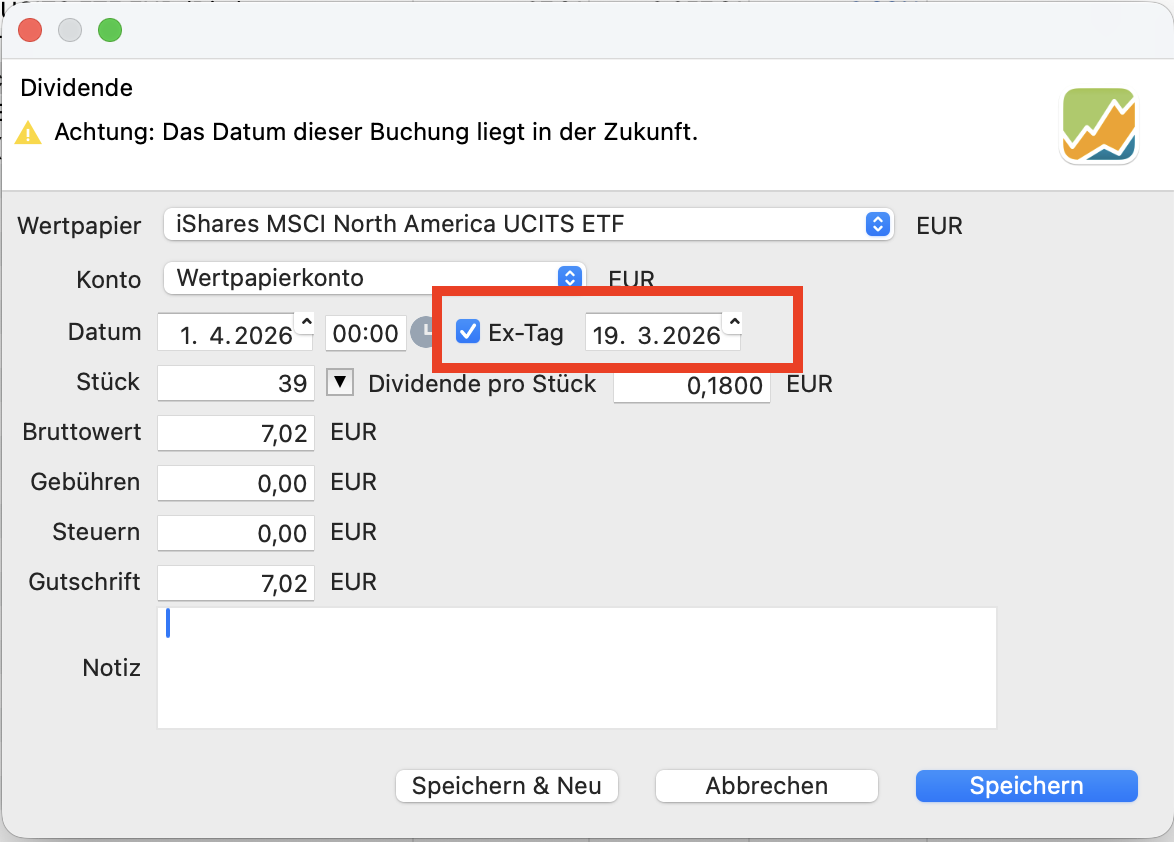 In einem ersten Schritt haben wir das Datenmodell dahingehend erweitert, dass Ihr das Ex-Datum zu einer Dividende (optional) erfassen könnt. Das Ex-Datum ist das Datum, an dem das Wertpapier ohne die Dividende an der Börse gehandelt wird. Aktuell wird das Datum noch nicht verwendet – es ist rein informativ und für die „Nerds“ unter Euch. Mittelfristig wollen wir es verwenden, um die Performance noch genauer zu berechnen (sie fällt am Ex-Datum an) und Dividenden besser den Positionen zuzuordnen (auch hier gilt das Ex-Datum).