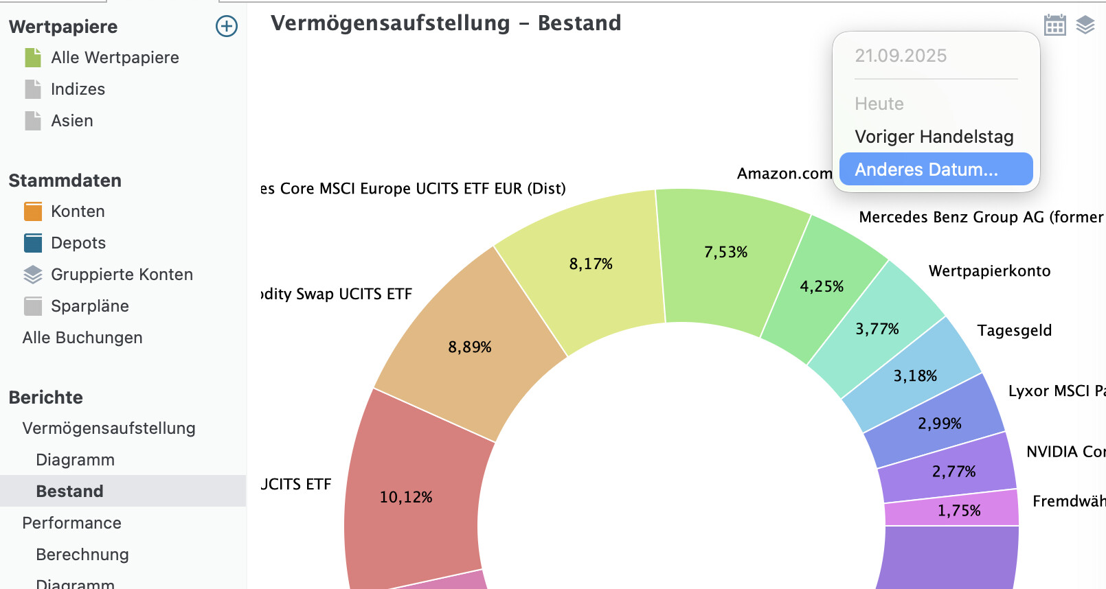 Neu: Im Kreisdiagramm der Bestände kann nun jedes Datum zur Anzeige der Bewertung ausgewählt werden.