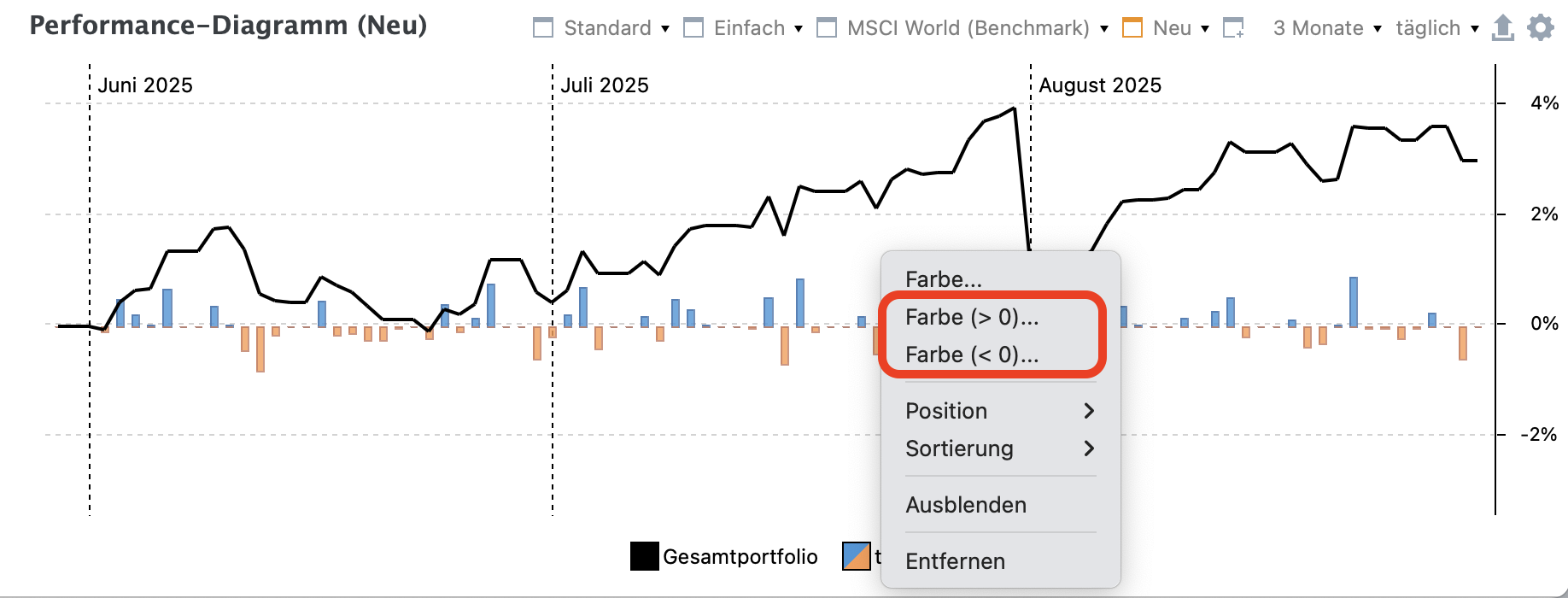 Neu: Das Balkendiagramm der täglichen Performance kann nun positive und negative Werte farblich unterscheiden