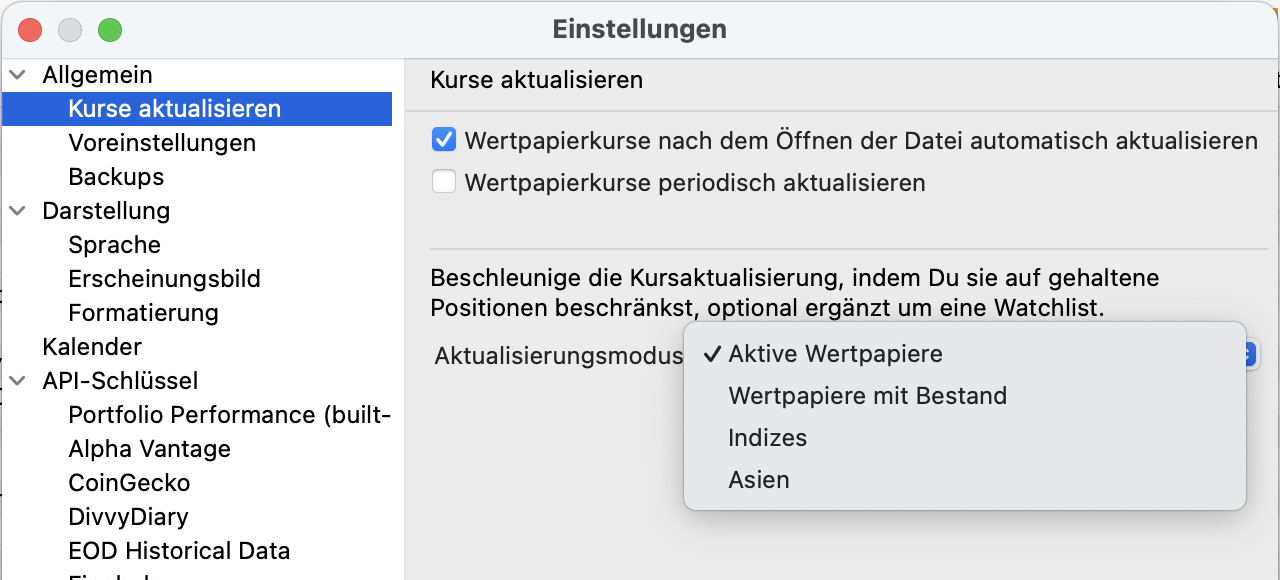 Und auch im Menü könnte Ihr die Aktualisierung von Kursen auf Wertpapiere mit Bestand oder auf eine Watchlist begrenzen.