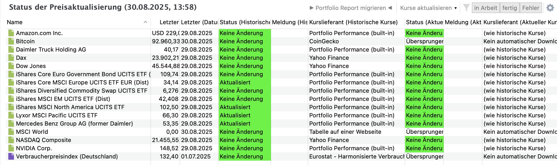 - Verbesserung: Neuer Hinweis im Fehlerprotokoll, wenn Kurse für Wertpapiere nicht abgerufen werden können – z. B. bei permanenten Fehlern, wenn der Server das Wertpapier nicht (mehr) kennt.