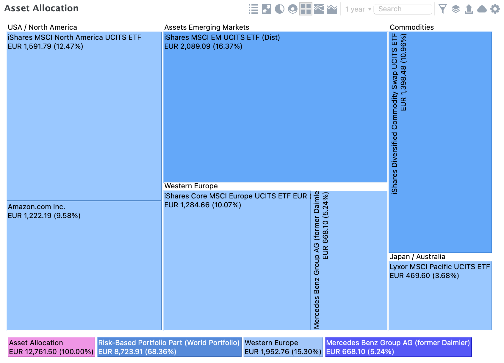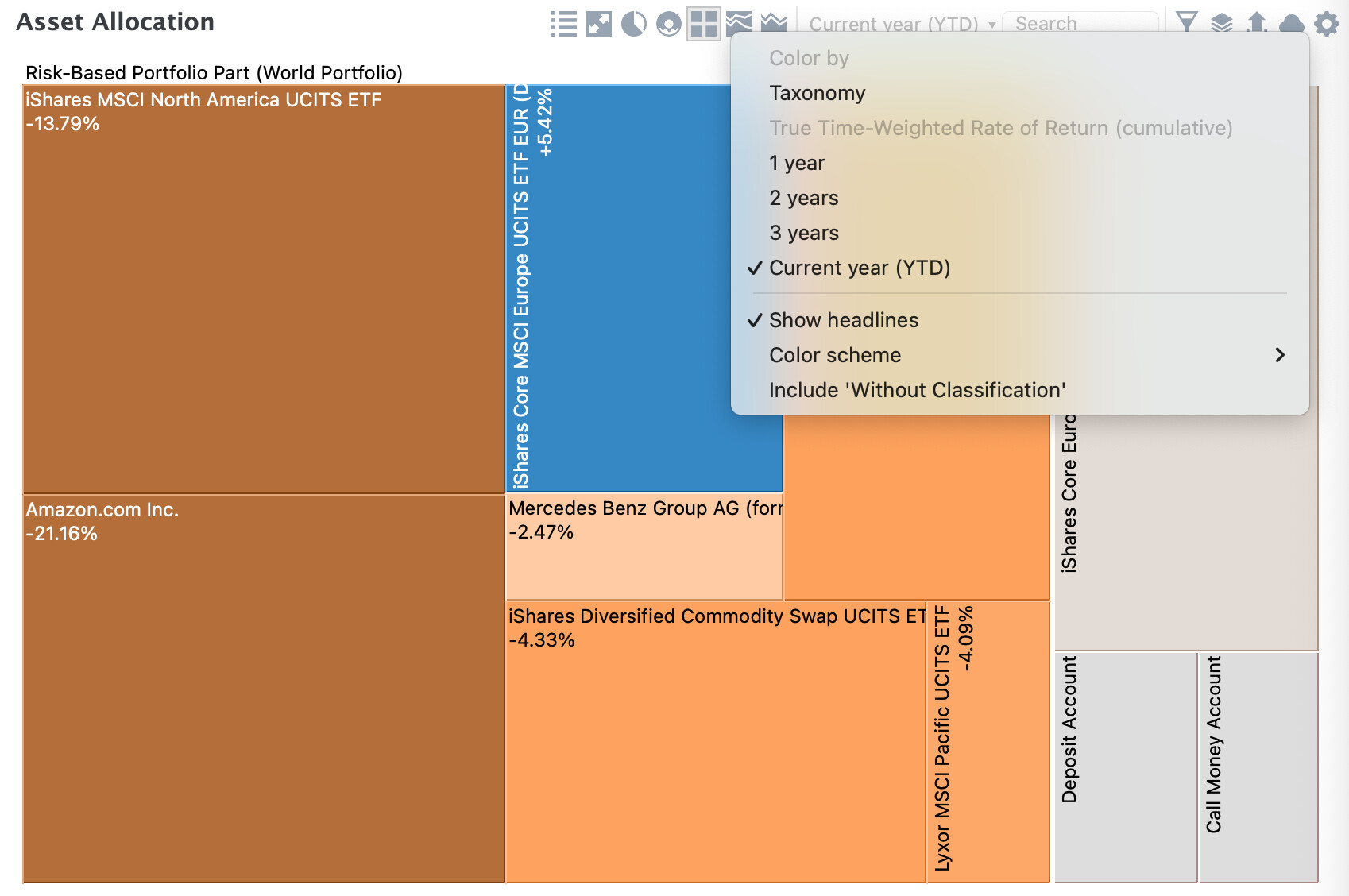 The treemap now offers two coloring options: by performance or, as before, by category. This allows you to see at a glance which areas have performed strongly or weakly. Performance is calculated according to TTWROR.