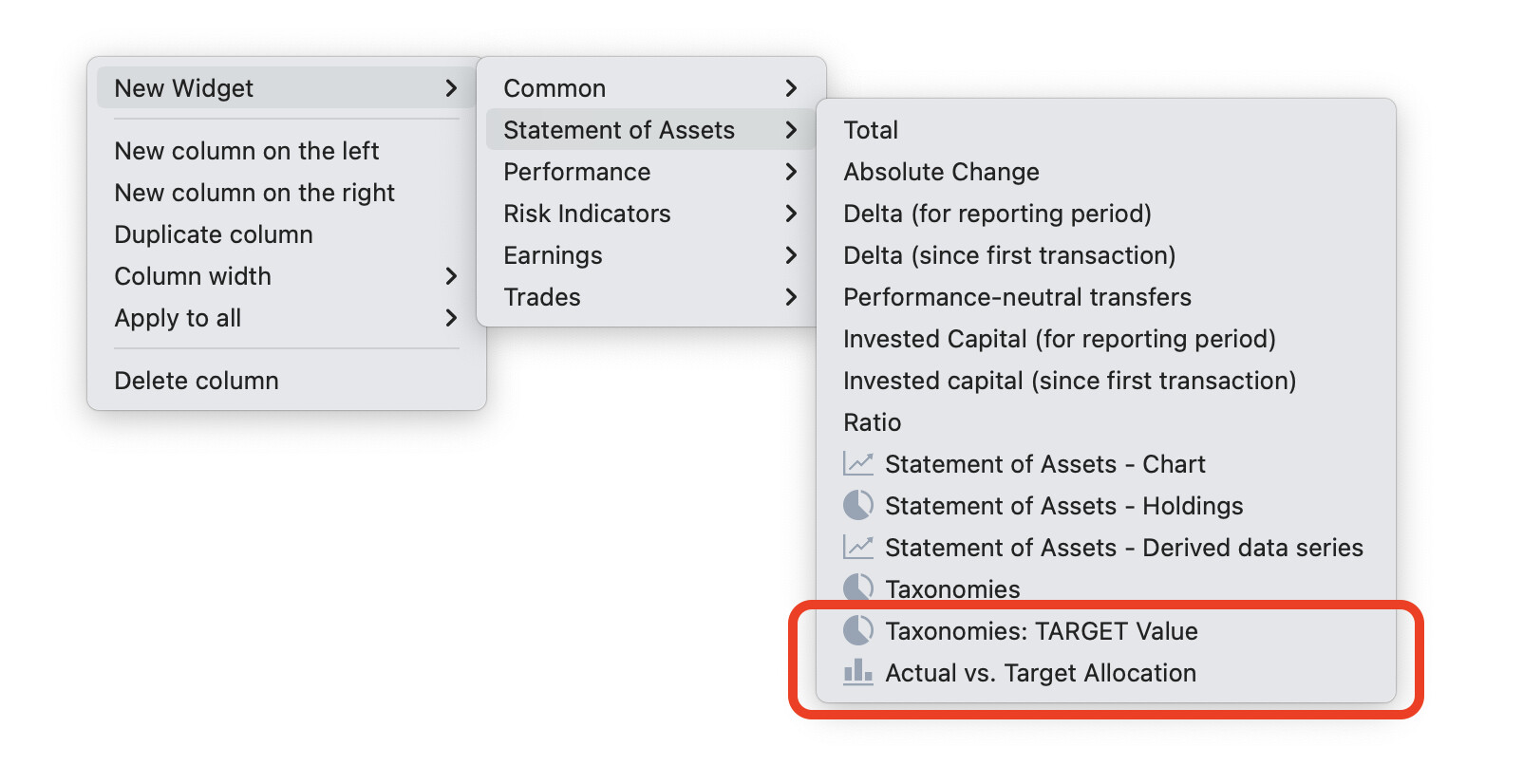 Two new widgets help you keep track of the deviation of your current asset allocation from the target state.