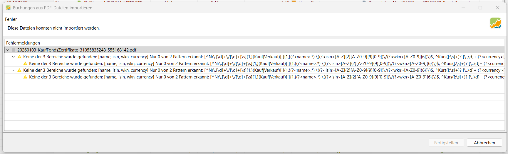 Der Import von PDF Dokumenten von Flatex.at hat Anfang Jänner nicht funktioniert. Nach den Updates war das vorübergehend klaglos möglich. Derzeit funktioniert der Import wieder nicht (Version 0.81.4). Ich übe mich in Geduld und warte auf ein Funktionsupdate.