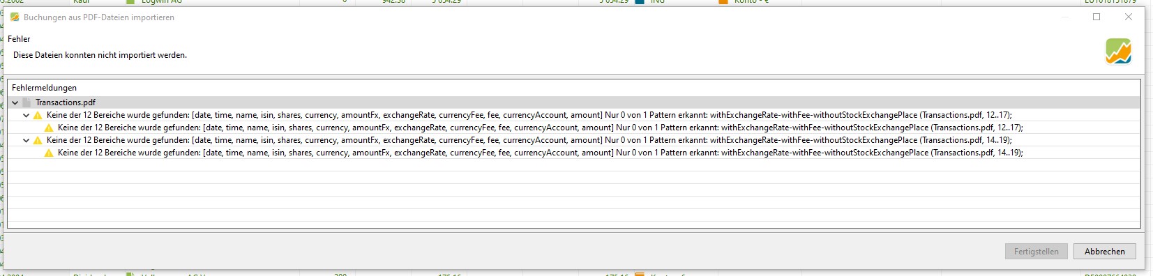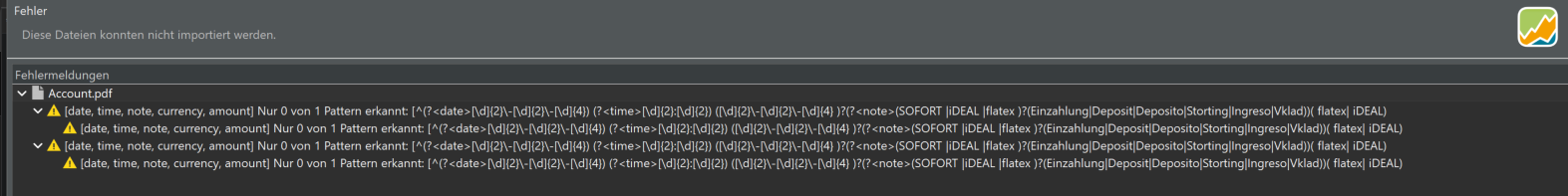 Bei mir funktioniert aktuell der PDF Import von Degiro nicht mehr. Ich erhalte beim Import der Account und Transaction PDFs die Fehlermeldung, dass die notwendigen Patterns oder Bereiche im PDF nicht gefunden werden.