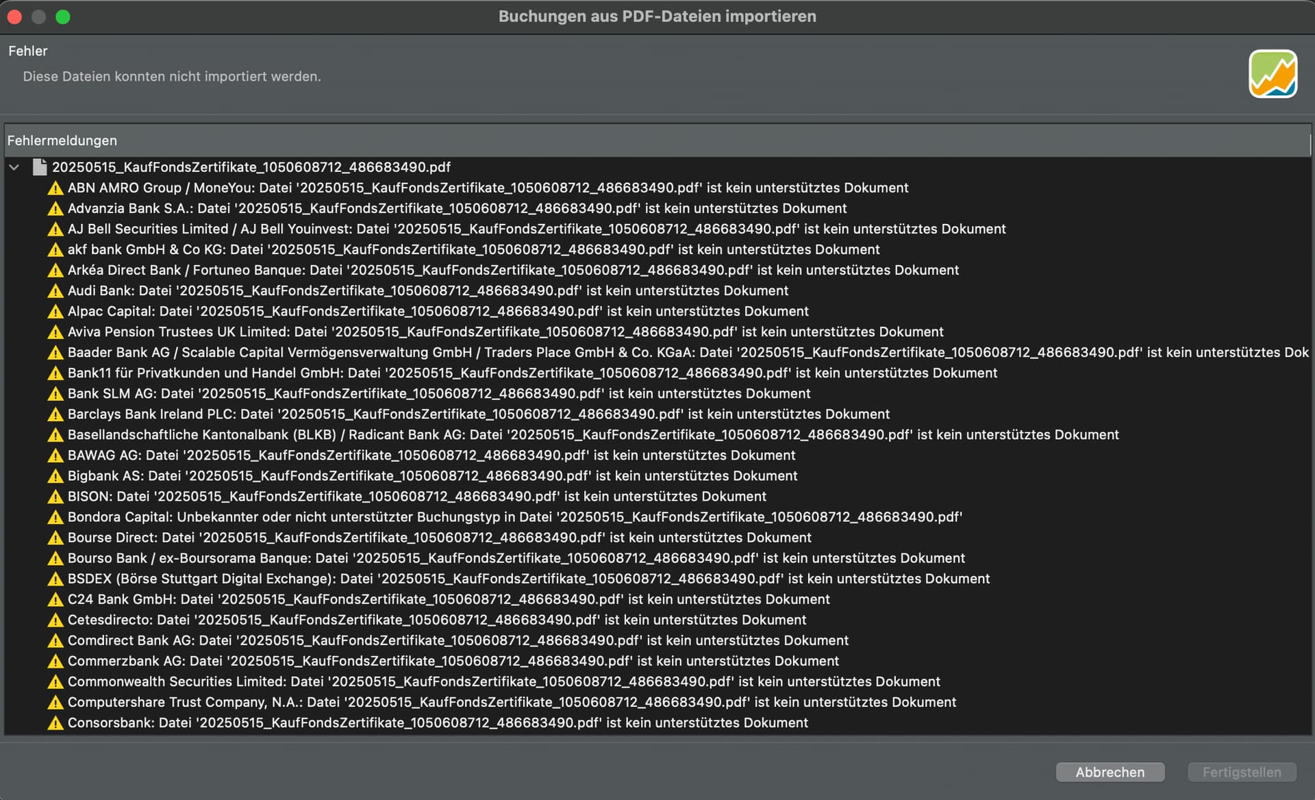 Die Dokumente werden nicht mehr erkannt. Als Fehlermeldung bekomme ich eine Liste aller Banken und hinter jeder steht “…pdf ist kein unterstütztes Dokument”. Da es mein Hauptbroker ist mit entsprechend vielen Dokumenten ist das sehr lästig, da ich alles händisch einpflegen muss. (Andere Banken funktionieren normal.)