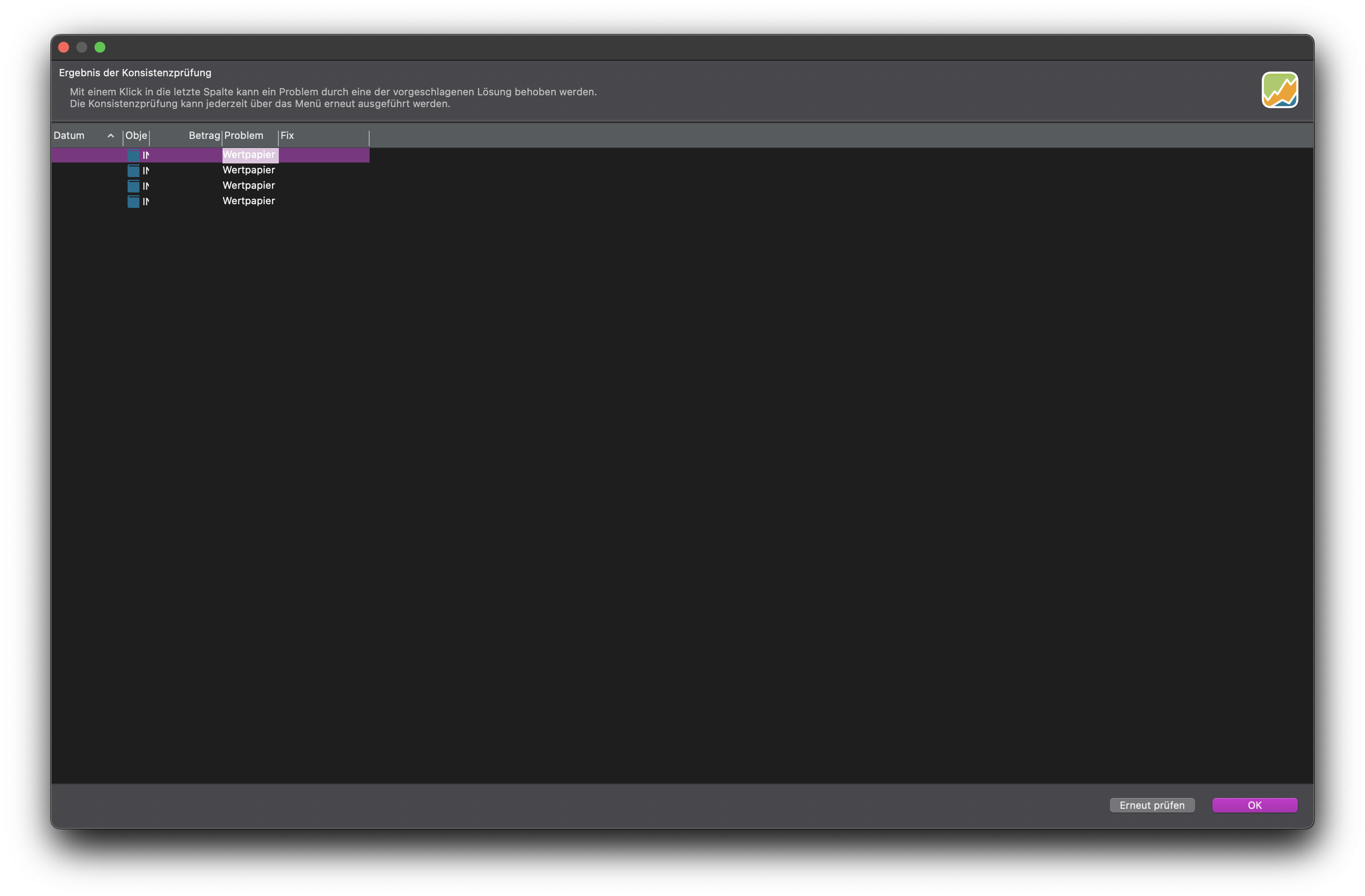 Die Konsistenzprüfung öffnet doch aber ihren Dialog. Wäre es nicht sinnvoll, man springt von dort in die Buchungen zum Wertpapier und löscht z.B. eine Buchung?
