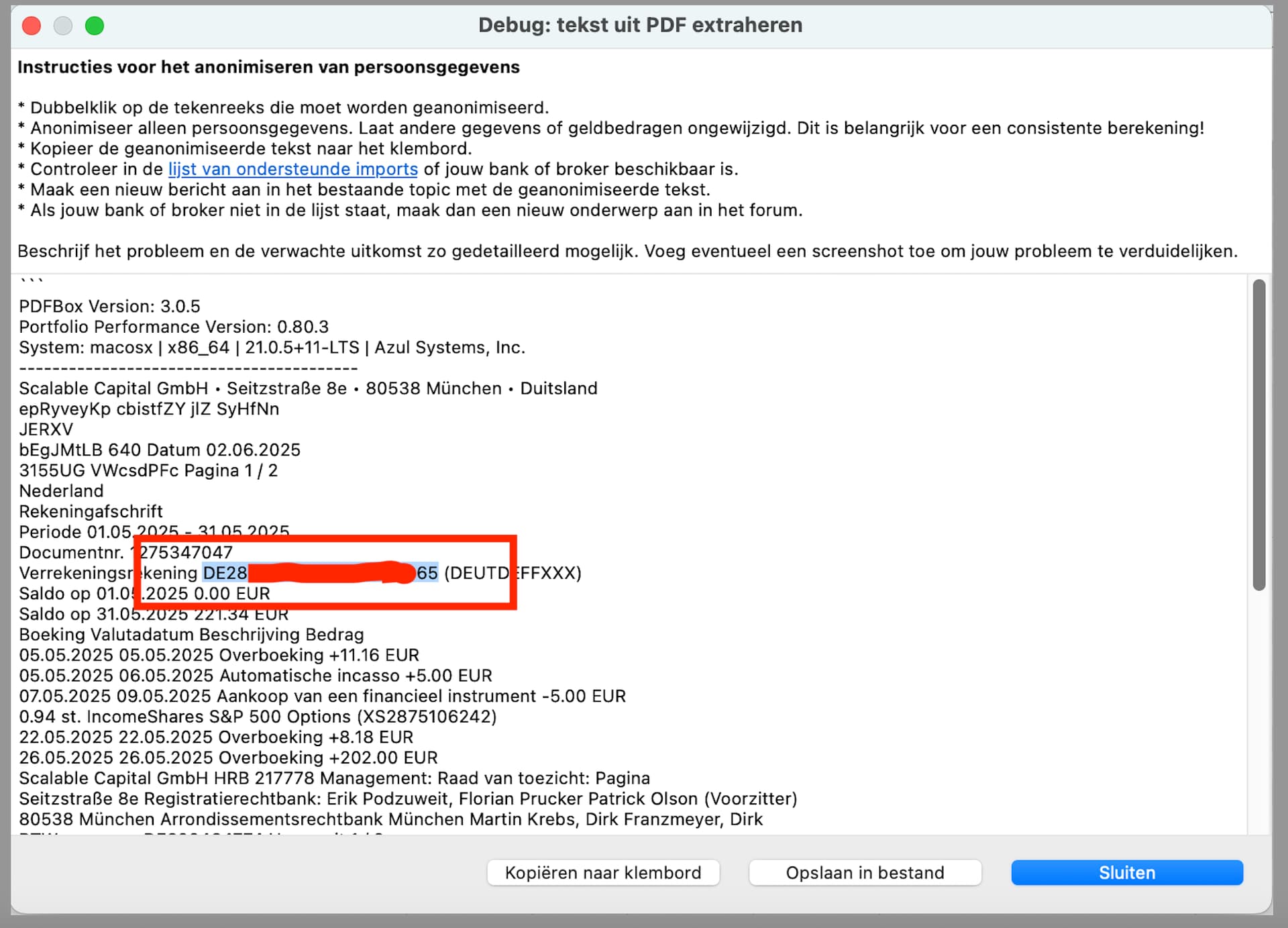 I use Scalable Capital from the Netherlands and use Dutch as language. However, PP will not accept the Dutch version of the monthly statement. So I wanted to request for a feature to make it possible to support the Dutch version of the documents of the new Scalable Capital Bank. When I wanted to upload my Monthly statement in Dutch, and was trying to scramble the private items, I found that it was not possible to scramble the actual IBAN number of my ‘Verrekeningsrekening’ (‘Settlement account’ or ‘Verrechnungskonto’). I can scramble the word ‘Verrekeningsrekening’ and the BIC number.